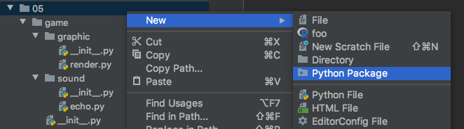 먼저 간단하게 게임을 만든다는 가정을 하고, 패키지를 만들기위해 필요한 디렉토리를 아래와 같이 구성해 보자. (이 부분은 자신의 컴퓨터 환경(Windows, Mac OS, Linux 등)에 따라 다를 것이다.) 필자의 경우 파이참을 사용중이며 이곳에서는 아래처럼 Python Package를 선택 할 수 있는데, 말이 Python Package이지 그냥 디렉토리라고 생각하면 된다.