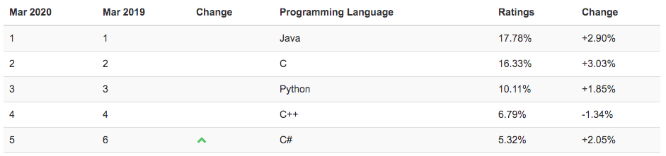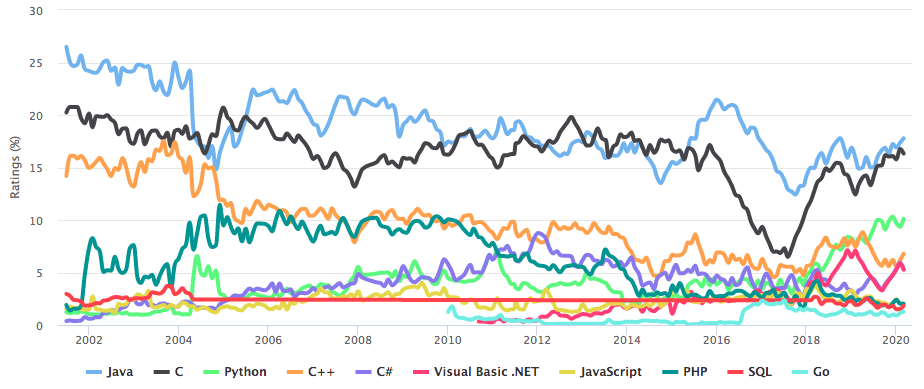 2020년 3월 TIOBE 지수와 2000년대 초반 부터의 프로그래밍 사용 빈도 그래프를 보면 C언어의 사용 빈도를 알 수 있습니다.